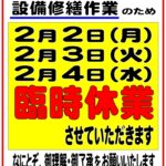 続きを読む: 5F 展望浴場 臨時休業のお知らせ全館メンテナンス前に5F 展望浴場 一度お休みをいただきます。 2/2(月)2/3(火)2/4(水) の3日間です。浴室周りの修…