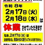 続きを読む: 2026.1.24~ イベント開催に伴う対応2026.1.24~ ゆ~さ浅虫の敷地内で行われるイベントについての対応をお知らせいたします。 詳細は右記リンクよりご覧下さい…