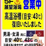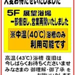 続きを読む: 5F展望浴場 再開いたしました (#^.^#)1か月弱、大変お待たせいたしました。 男女とも 中温(40℃)浴槽のみ ではございますが、本日より営業再開いたしました。 高温(…