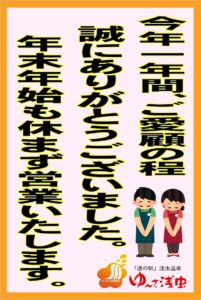 年末年始は休まず、お土産コーナー・ゆ~さ市場・展望浴場 営業いたしますが、 今年も1年ありがとうございました (#^.^#) 人の動きが大変多くなりますので、インフルエンザ・コロナなどにかからないように、対策をした上でお […]