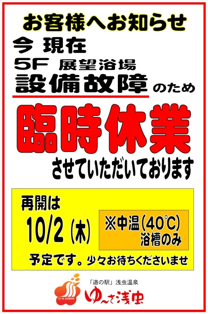 9月4日(木)より設備故障の為臨時休業していました5階展望浴場ですが