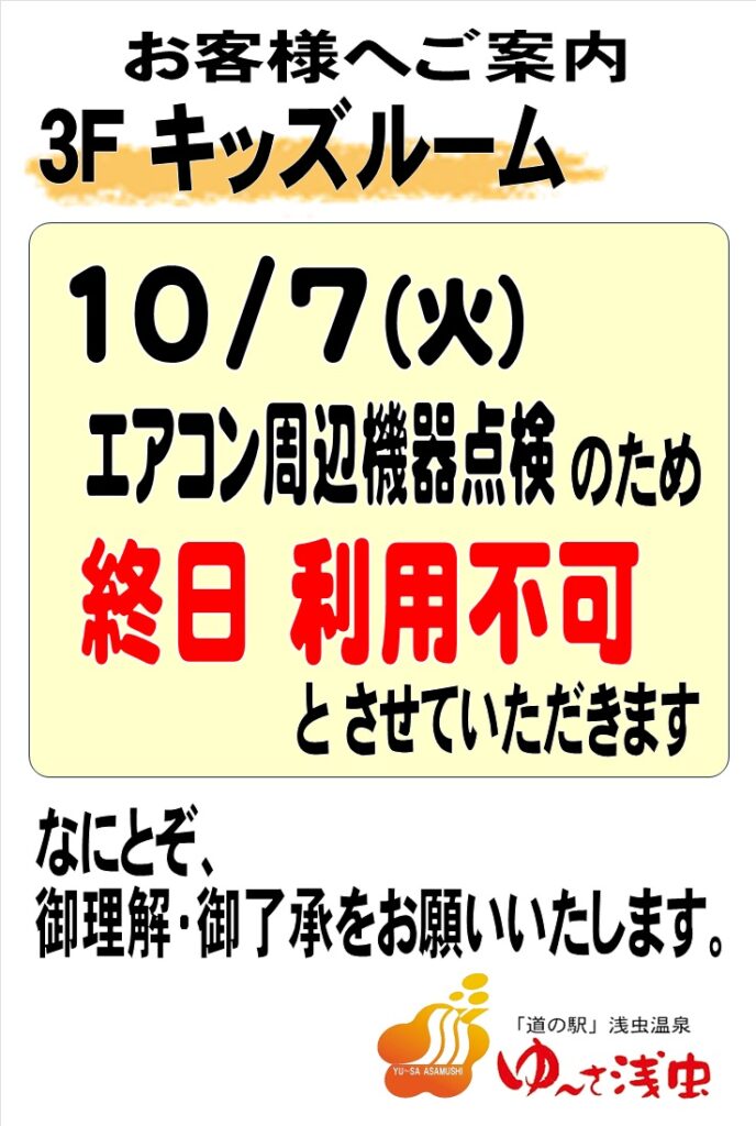 2025年9月30日 最終更新日時 : 2025年9月30日 yusa_user 3Fキッズルームのエアコン故障から、2か月経ってしまいましたが、 10/7(火)にキッズルーム内のエアコン周りの機器の点検のため、終日 利用不可 となります。 なにどぞ、御理解・御了承をお願いいたします。