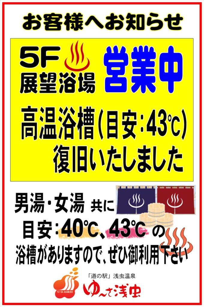 浴場の設備修繕が無事終わりまして、高温浴槽も使用可能となりました