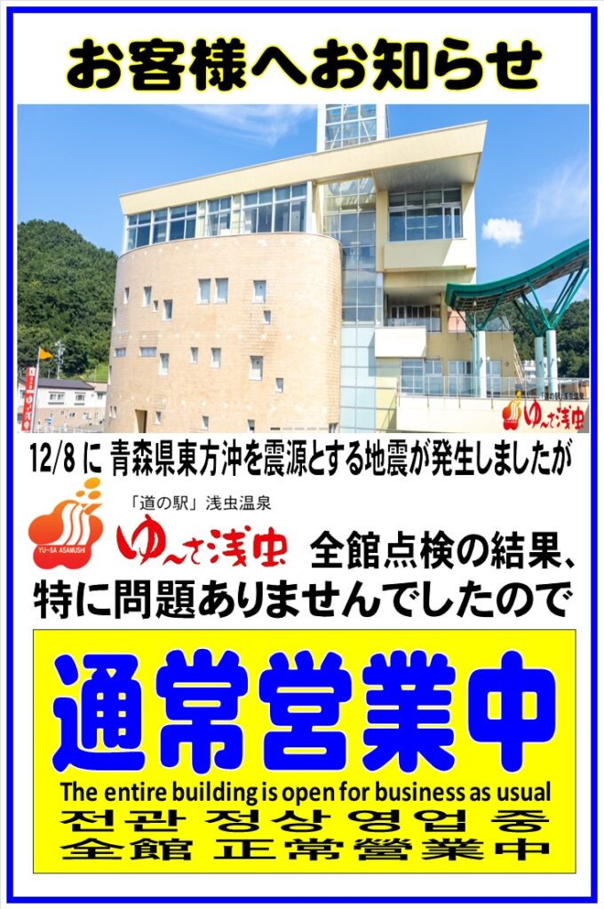 ゆ~さ浅虫 通常営業中!! (^^)/ 2025年12月9日 最終更新日時 : 2025年12月9日 yusa_user 12/8 夜に青森県東方沖を震源とする地震が発生しましたが、 本日、全館点検の結果、特に問題ありませんでしたので、通常営業中 でございます。 皆様の御来館をお待ちしております m(__)m