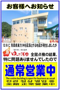 12/8 夜に青森県東方沖を震源とする地震が発生しましたが、 本日、全館点検の結果、特に問題ありませんでしたので、通常営業中 でございます。 皆様の御来館をお待ちしております m(__)m